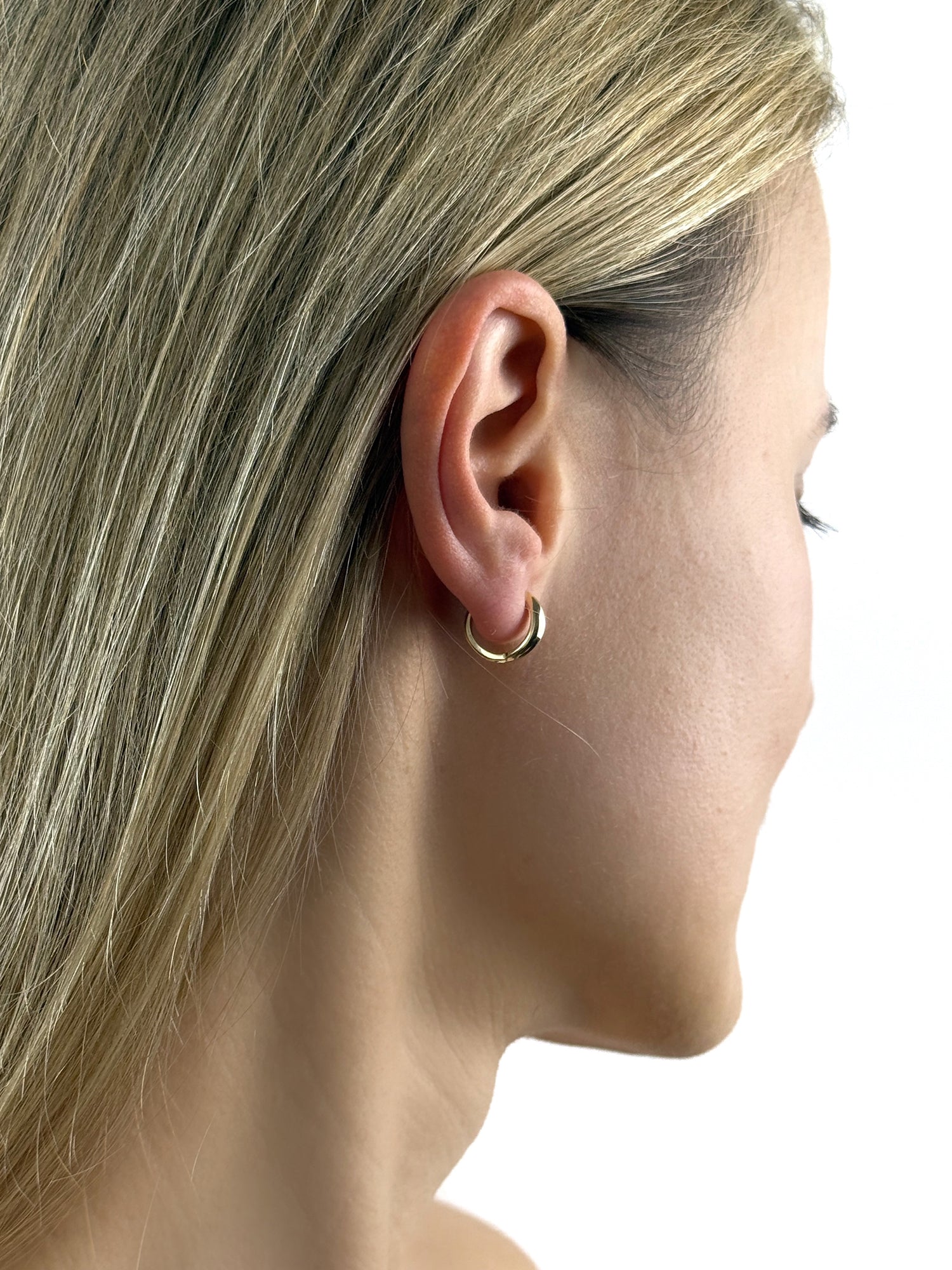 Unsere Sleek Hoops sind sanft gewölbt und perfekt gebauscht, mit einem luxuriösen, spiegelähnlichen Finish, das Licht aus jedem Winkel einfängt. Mit 12 mm schmiegen sie sich perfekt an das Ohrläppchen – auffällig genug, um allein zu stehen, aber dennoch leicht zu stapeln.