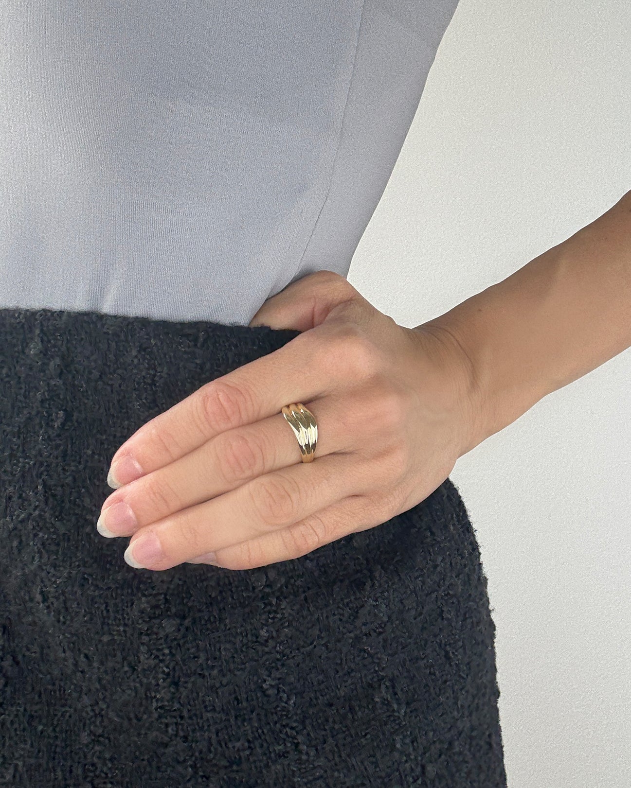 Pierścionek Bold Wave łączy w sobie miękkie kształty i wyrazisty blask w jednym, płynnym wzorze. Wykonany z litego złota z żłobioną powierzchnią, która odbija światło z każdej strony, stanowi subtelny akcent — jest wystarczająco wygodny do noszenia na co dzień, ale jednocześnie wystarczająco stylowy, by prezentować się sam.
