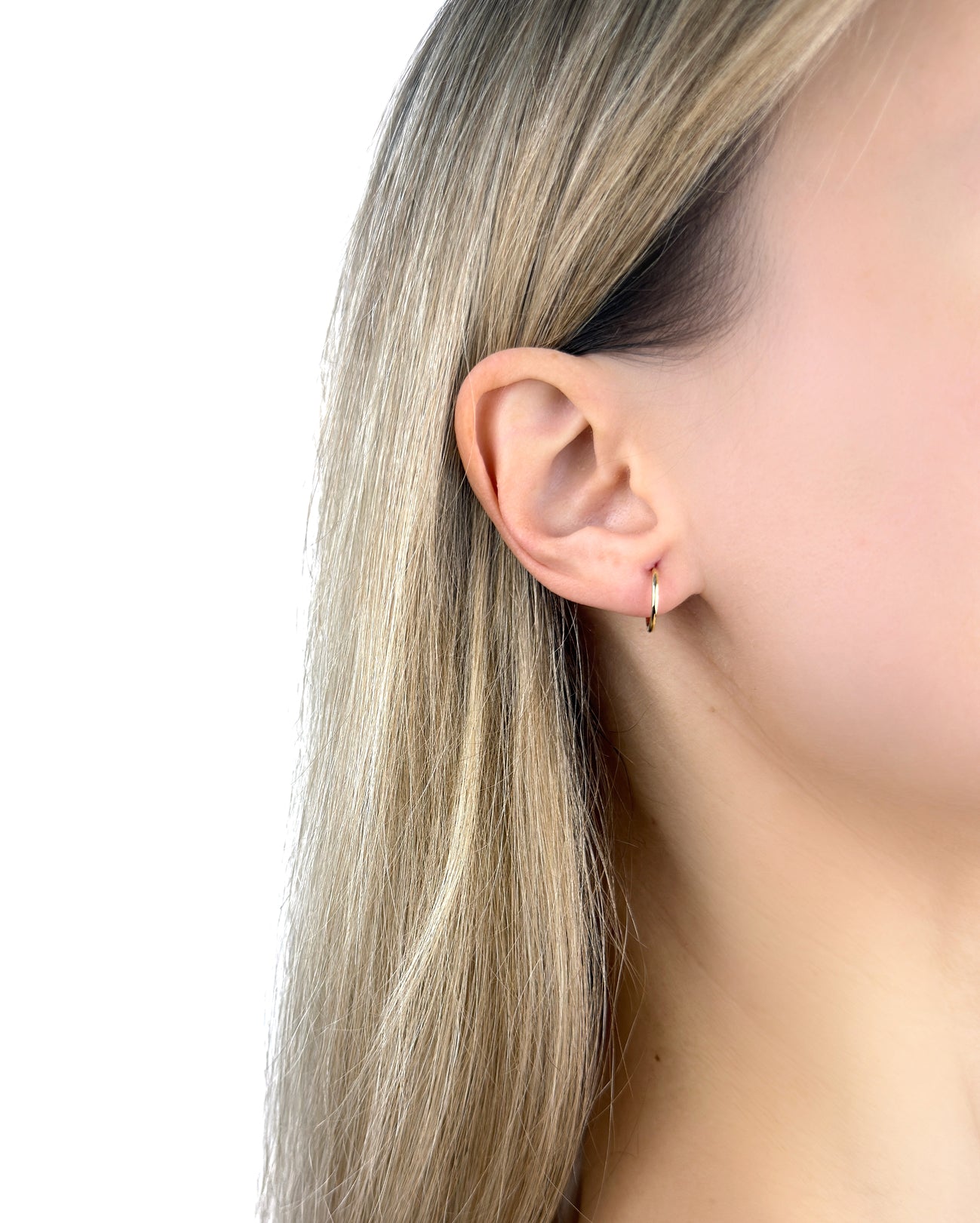 The Core Huggies are your everyday go-to: lightweight, durable, and endlessly wearable. Made in solid gold and finished with a clean snap closure, they sit snug against the lobe and shine from every angle.