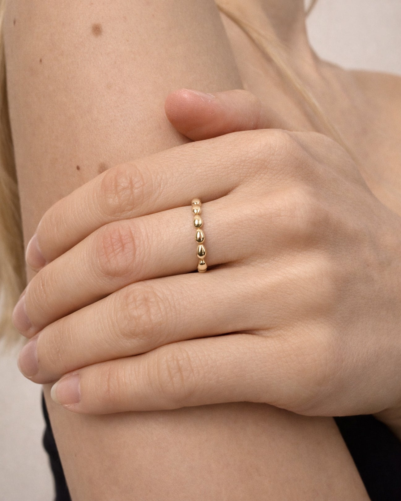 The Droplet Ring features a slender band of soft, teardrop-shaped forms - like tiny golden raindrops captured mid-fall.